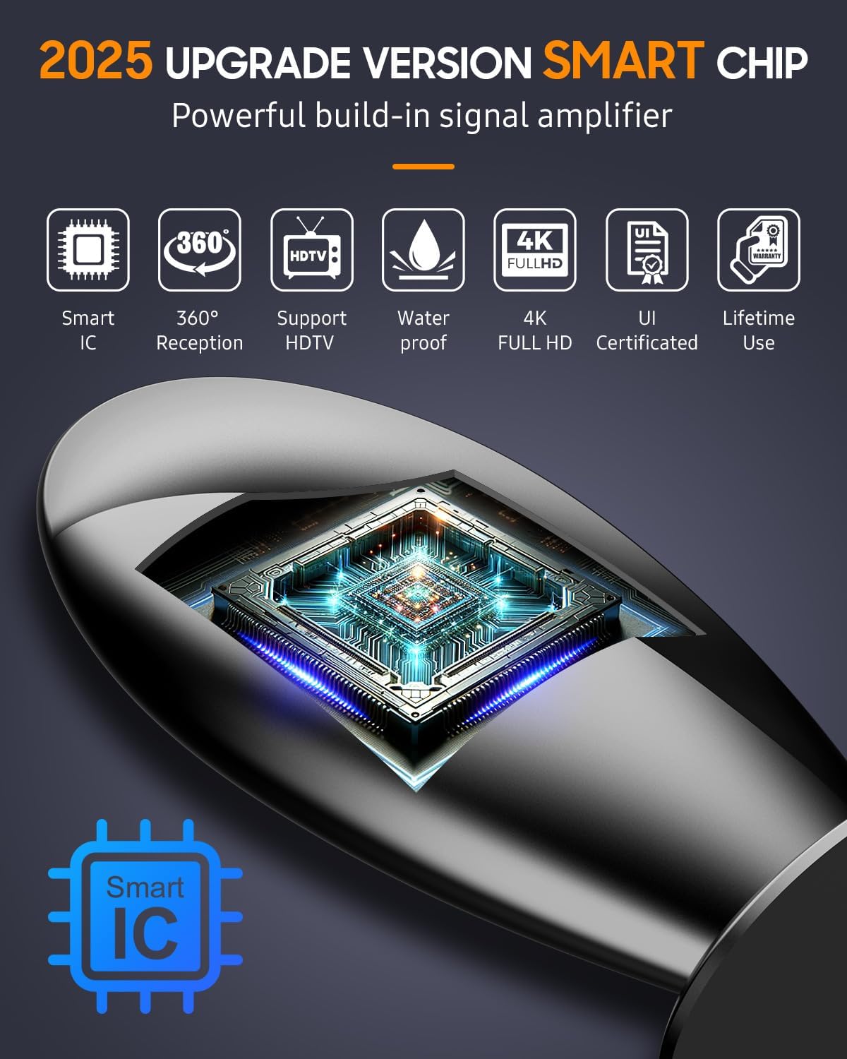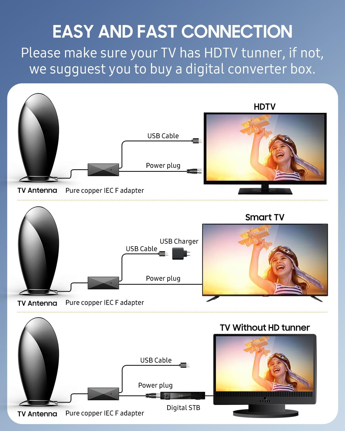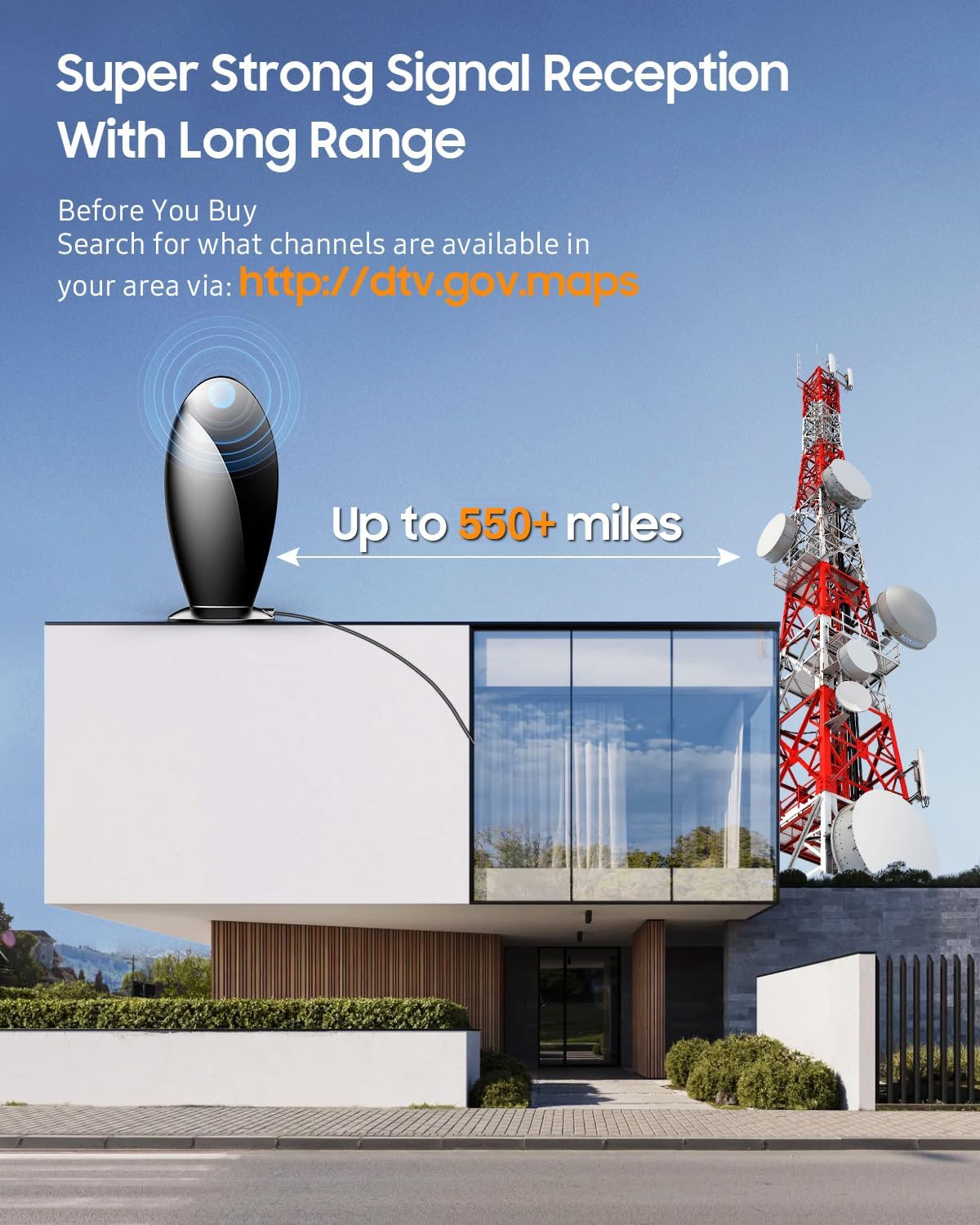 【550 Miles Long-Distance Reception】Our TV antenna for smart TV built-in powerful signal booster which provides Up to 550 Miles Long Range in 360° reception.Ensuring a HD crystal clear picture no matter where it’s placed in your home.Advanced signal enhancers enhance signal transmission protection, ensuring access to more channels even when away from broadcast towers.
