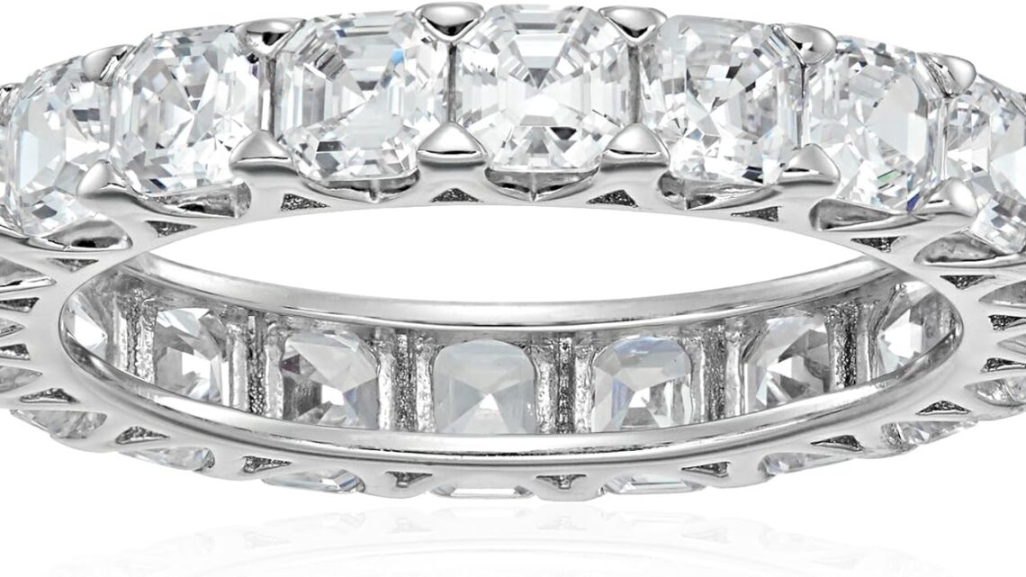 Amazon Essentials Platinum-Plated Sterling Silver Infinite Elements Cubic Zirconia Asscher-cut Eternity Band Ring, (previously Amazon Collection)