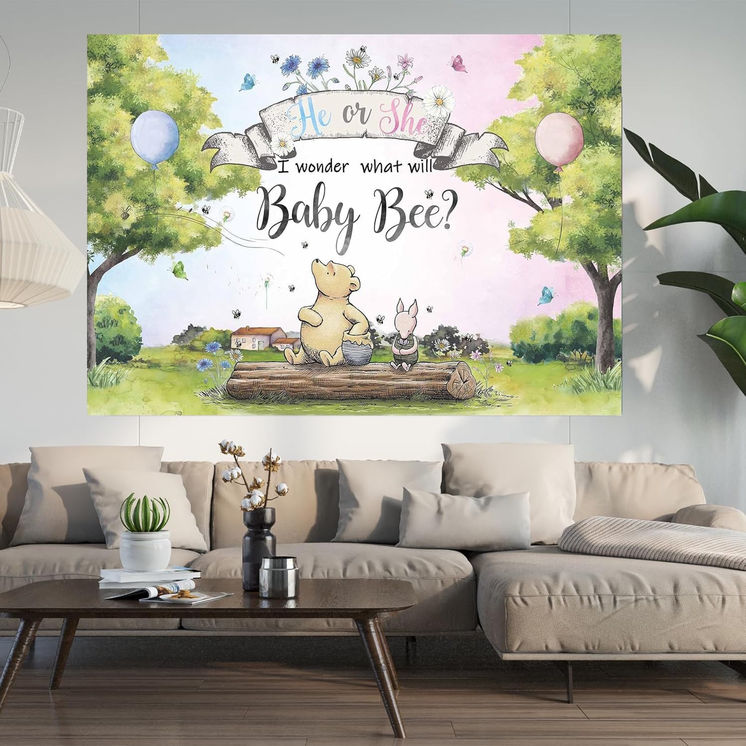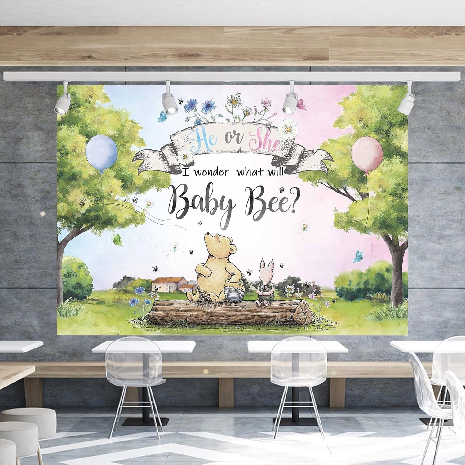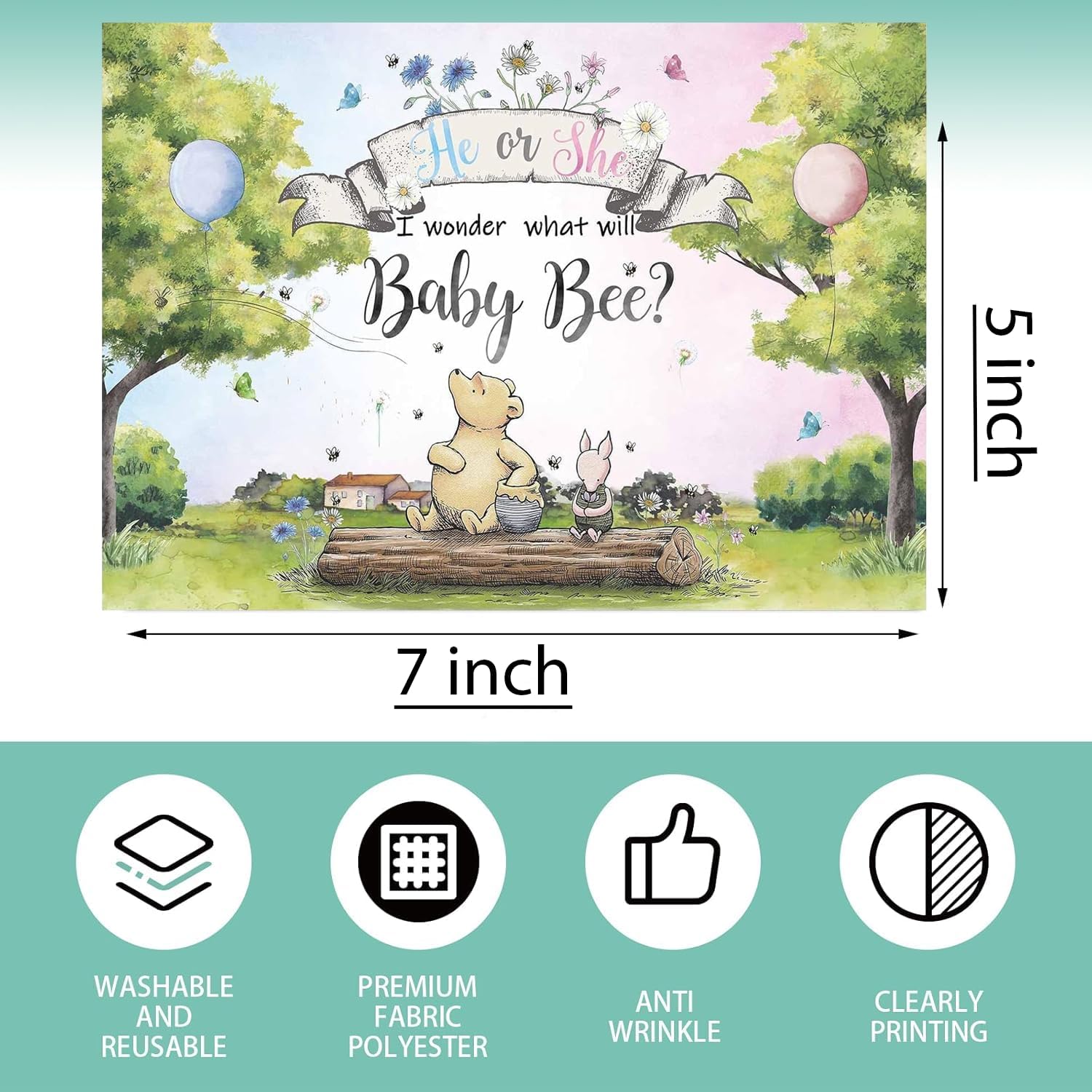Adorable Classic Bear Design: Features a charming bear-themed backdrop with blue and pink balloons, perfect for gender reveal parties, baby showers, and “He or She” celebrations.