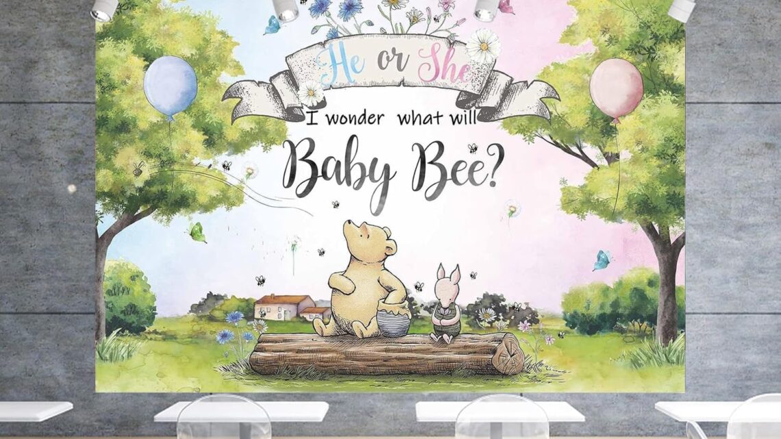 Adorable Classic Bear Design: Features a charming bear-themed backdrop with blue and pink balloons, perfect for gender reveal parties, baby showers, and “He or She” celebrations.