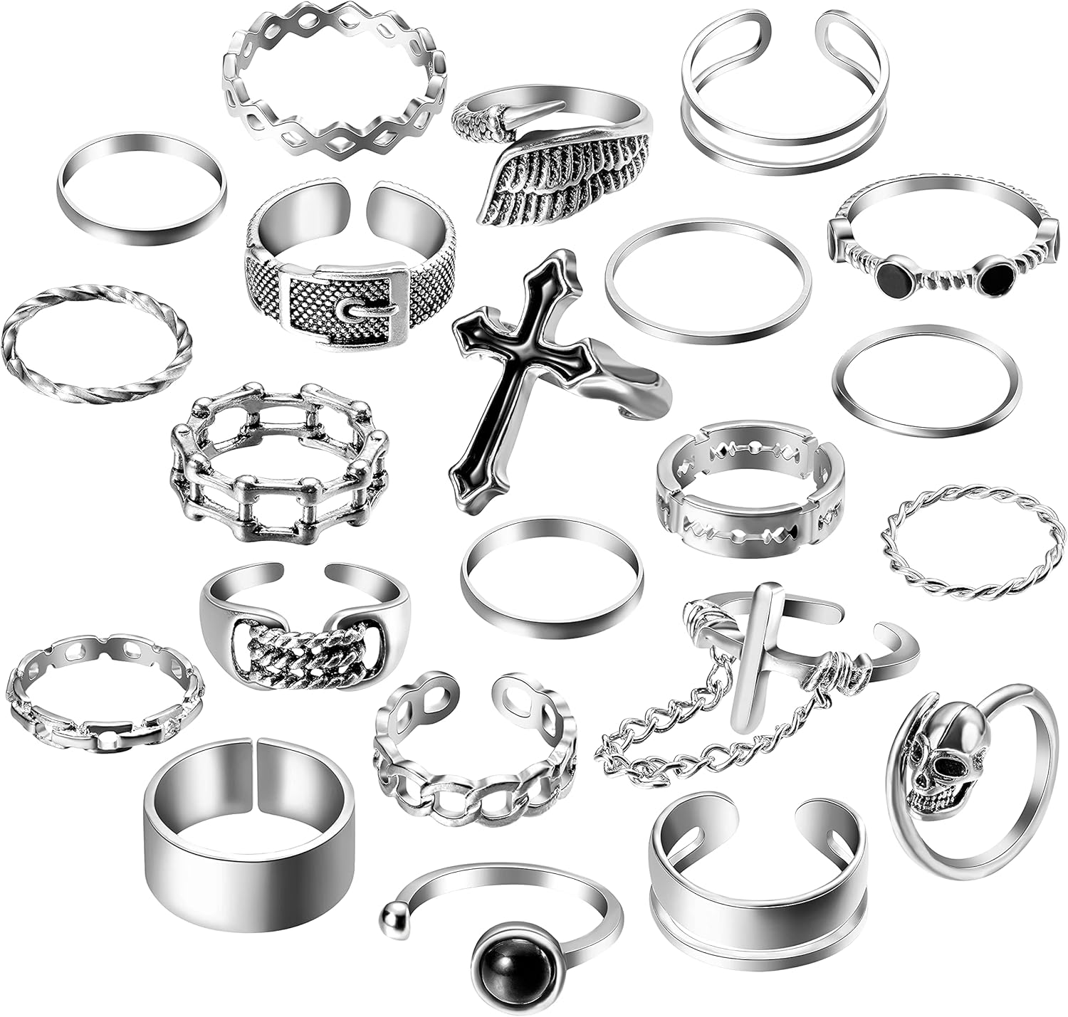 PANTIDE Vintage Punk Rings Set Gothic Knuckle Midi Rings Adjustable Alloy Chain Belt Cross Stackable Finger Half Open Rings Fashion Joint Jewelry for Women Men (Silver) 22Pcs