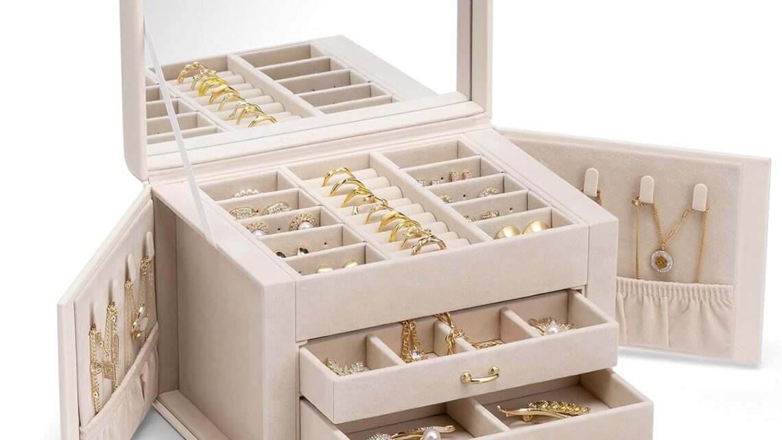 Vlando Jewelry Box 4-Tier,Jewelry Boxes & Organizers with Handle,3 Drawers Travel Jewelry Case with Mirror,Jewelry Storage,Earrings Necklace Rings Valentine Birthday Gift for Women Girl Apricot White