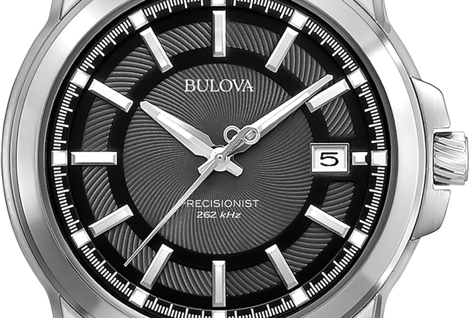 The Precisionist collection masterfully combines unparalleled accuracy to seconds per year, continuous-sweep second hand and intricate details for timeless style. In stainless steel with multiple-layer swirl-pattern charcoal gray dial, silver continuously sweeping second hand, luminous hour and minute hands, faceted stick markers with luminous squares, calendar, and black leather strap. Powered by Bulova’s proprietary three-prong quartz crystal Precisionist movement with a 262kHz vibrational frequency–eight times greater than standard quartz watches–for unparalleled accuracy.