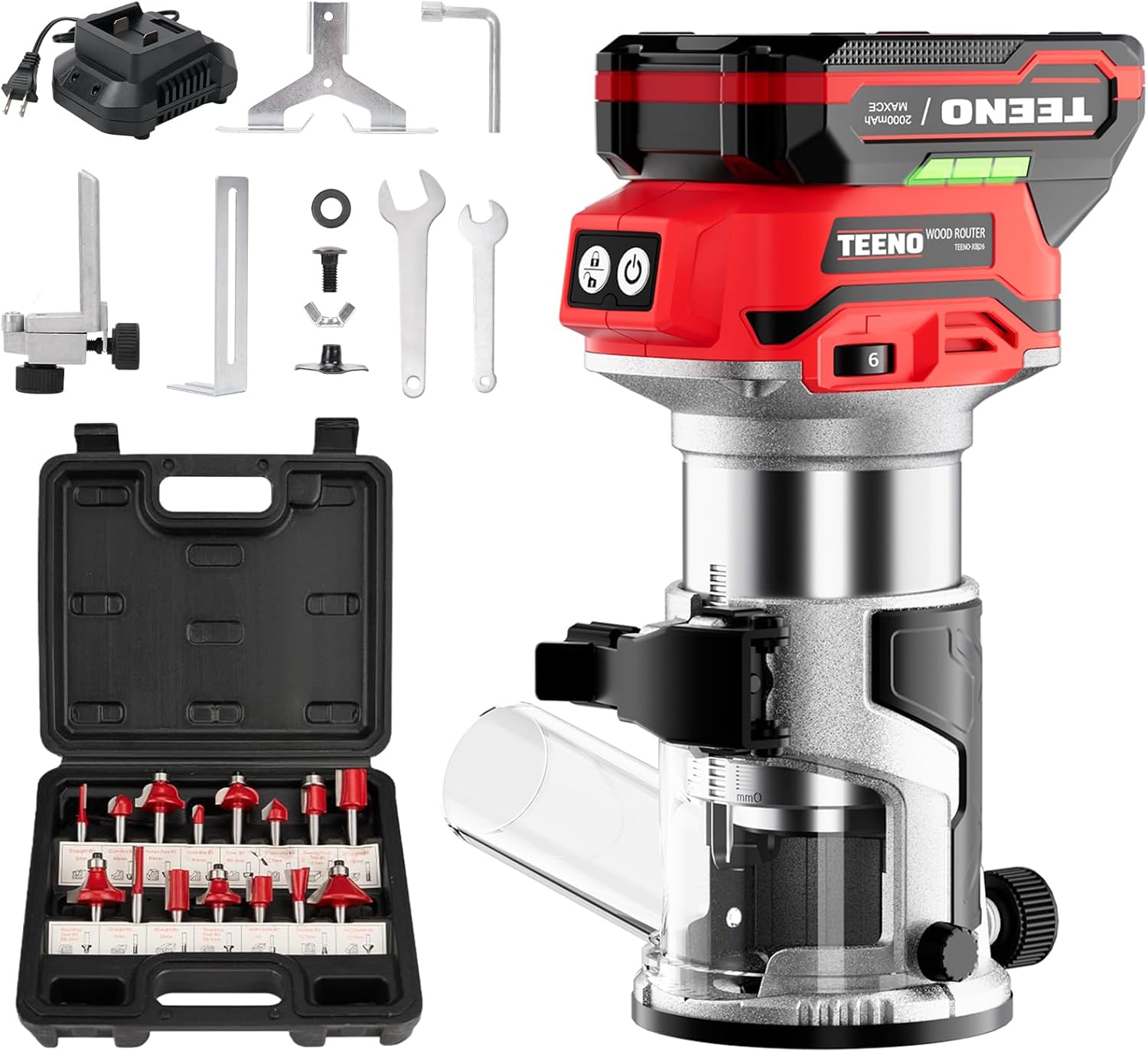 TEENO Cordless Compact Router Tool for Woodworking, Wood Router Brushless Motor with Trim Router Bits, 6 Variable Speeds, 15PCS 1/4″ Router Bits, Edge & Roller Guides, Dust Hood(1 Battery)
