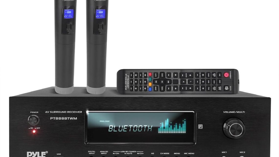 Pyle 1000W Bluetooth Home Theater Karaoke Receiver – 5.2-Ch Stereo Amplifier 2 UHF Wireless Microphone Video Pass-Through Supports, MP3/USB/HDMI/AM/FM Radio – Pyle PT888BTWM , Black