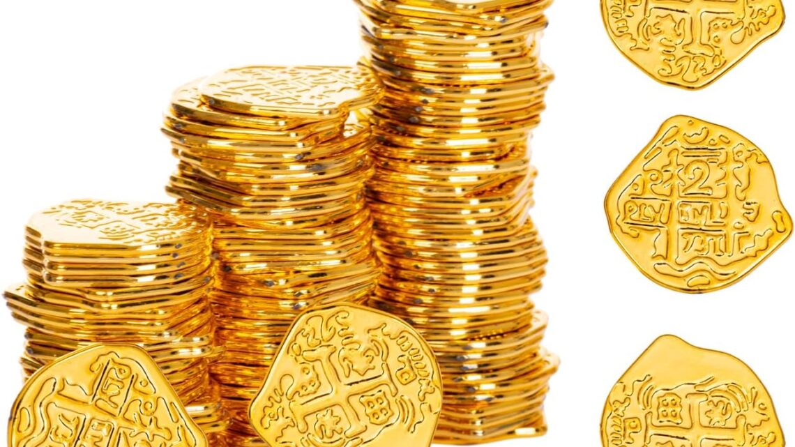 120 Pieces Plastic Pirate Coins,Fake Play Coins Replica Spanish Doubloons for Halloween,St.Patrick’s Day Treasure Hunts, Chests, Cauldrons Decorations