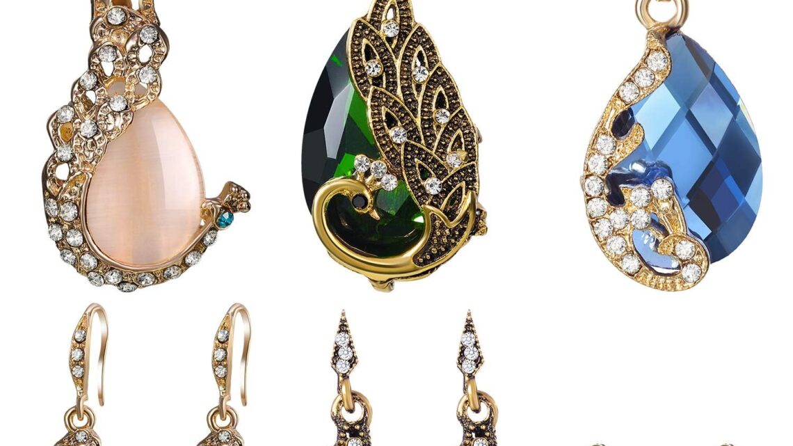Hicarer 6 Pieces Jewelry Sets for Women Elegant Necklace Set Peacock Water Drop Rhinestone Pendant Necklace Crystal Peacock Pattern Earrings Jewelry