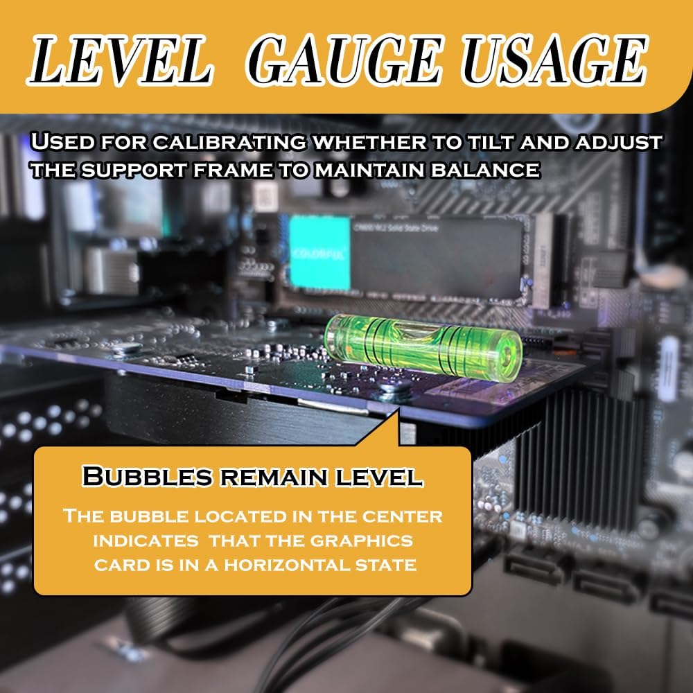 【NOTES】Our graphics card GPU brace support does a good job of preventing GPU sag, after determining the height you need to use, please tighten the red fixing ring to the bottom to ensure strong stability. We have also prepared a mini bubble spirit level for you to make sure your Graphics Card is flat