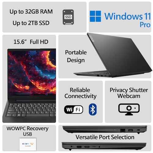 Accessory: WOWPC 3-IN-1 500GB Bundle Hard drive enclosure (500GB storage) Microfiber cloth Hotkey sticker Processor: Intel Celeron N5100 (4 Core, 4 Threads, Up to 2.8GHz) Graphics: Intel UHD Graphics Operating system: Windows 11 Pro 64-bit Memory: Up to 32GB DDR4 SDRAM Hard Drive: Up to 2TB 2.5″ Solid State Drive Optical Drive: No Display: 15.6″ FHD (1920×1080) TN 250nits Anti-glare Connectivity: Wi-Fi 5 + Bluetooth 5.1 Audio: Stereo speakers, 1.5W x2, Dolby Audio Keyboard: US English, Full Size Keyboard with Numeric Keypad Built-in HD Webcam: HD 720p with Privacy Shutter Ports: 1 x USB Type-C 3.2 Gen 1 (support data transfer only) 1 x USB Type-A 3.2 Gen 1 1 x USB Type-A 2.0 1 x HDMI 1.4b 1 x Headphone / microphone combo jack (3.5mm) 1 x Ethernet Port (RJ-45) 1 x Power connector Color: Black Dimensions L x W x H (inches): 14.14 x 9.28 x 0.78 Weight: 3.75 lbs