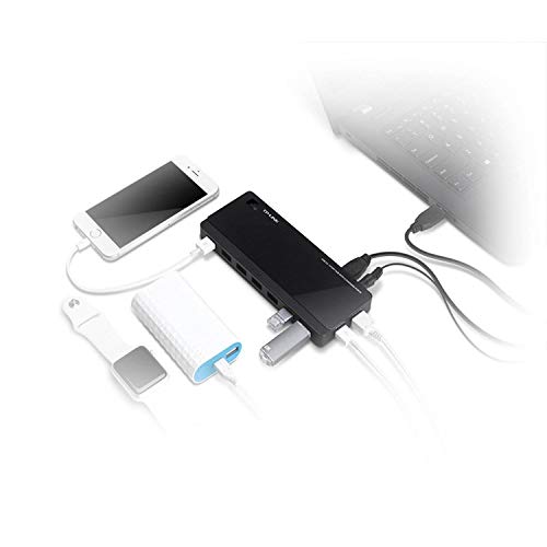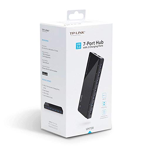 TP-Link UH720 is a 9-port USB hub. 7 USB 3.0 ports can be used for data sync and 2 ports are dedicated for quick charging. It also come with a power adapter to provide robust performance and a power on/off button to conveniently turn on/off the hub as need.